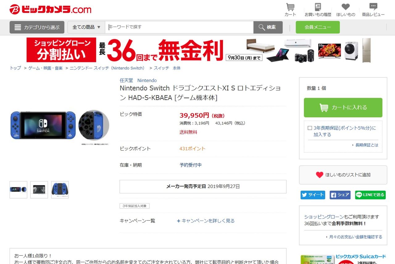 既に予約困難となっている『Nintendo Switch ドラゴンクエストXI S ロトエディション』ですが、”ビッグカメラ”様で今現在も予約可能な状況となっております。